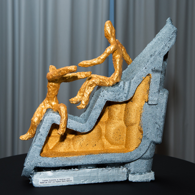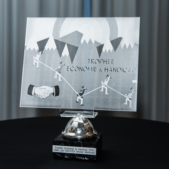 Pour l'année 2012, se sont 4 entreprises du Haut-Rhin qui ont été nominées : * secteurs commerce / services : le restaurant Mac Donald de Guebwiller et le Carré Médical de Mulhouse * secteur industrie : la Sté WRIGLEY de Biesheim et SES STERLING de Saint-Louis. Les 4 Trophées remis à ces employeurs ont tous été créés et confectionnés par des personnes handicapées pour l'occasion. Toutes nos félicitations aux nominés. Agnès GERBER Directrice d'Action et Compétence |