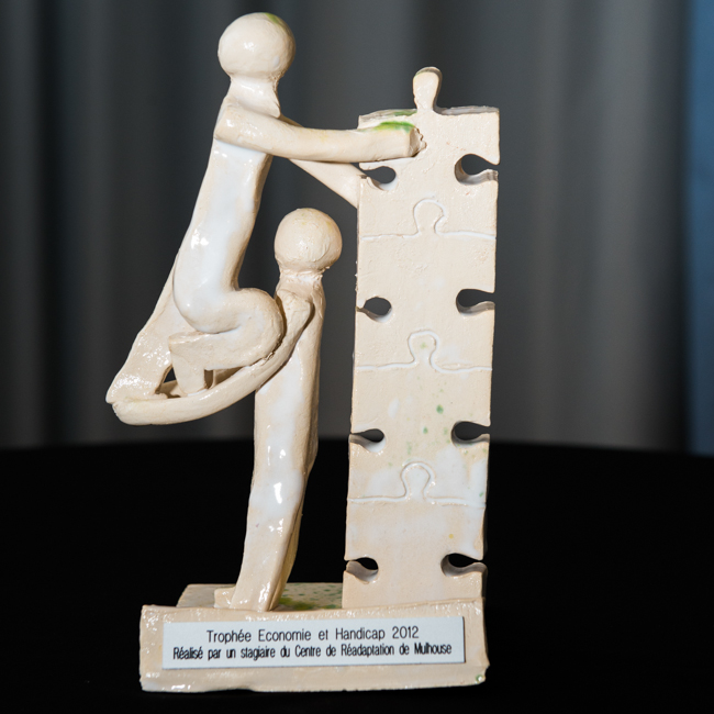 Pour l'année 2012, se sont 4 entreprises du Haut-Rhin qui ont été nominées : * secteurs commerce / services : le restaurant Mac Donald de Guebwiller et le Carré Médical de Mulhouse * secteur industrie : la Sté WRIGLEY de Biesheim et SES STERLING de Saint-Louis. Les 4 Trophées remis à ces employeurs ont tous été créés et confectionnés par des personnes handicapées pour l'occasion. Toutes nos félicitations aux nominés. Agnès GERBER Directrice d'Action et Compétence |