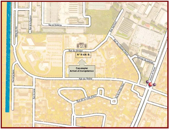 Sortie Autoroute "Porte Blanche", direction Plaine des Bouchers, Illkirch-Graffenstaden, puis suivre Illkirch Graffenstaden, prendre avenue du Doubs jusqu'au bout, puis tourner à gauche, puis 1ère à gauche (rue du Verdon).